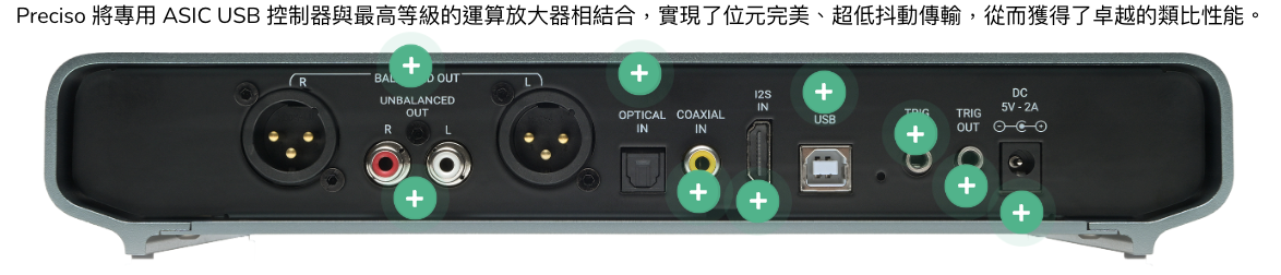 Preciso 將專用 ASIC USB 控制器與最高等級的運算放大器相結合,實現了位元完美、超低抖動傳輸,從而獲得了卓越的類比性能。